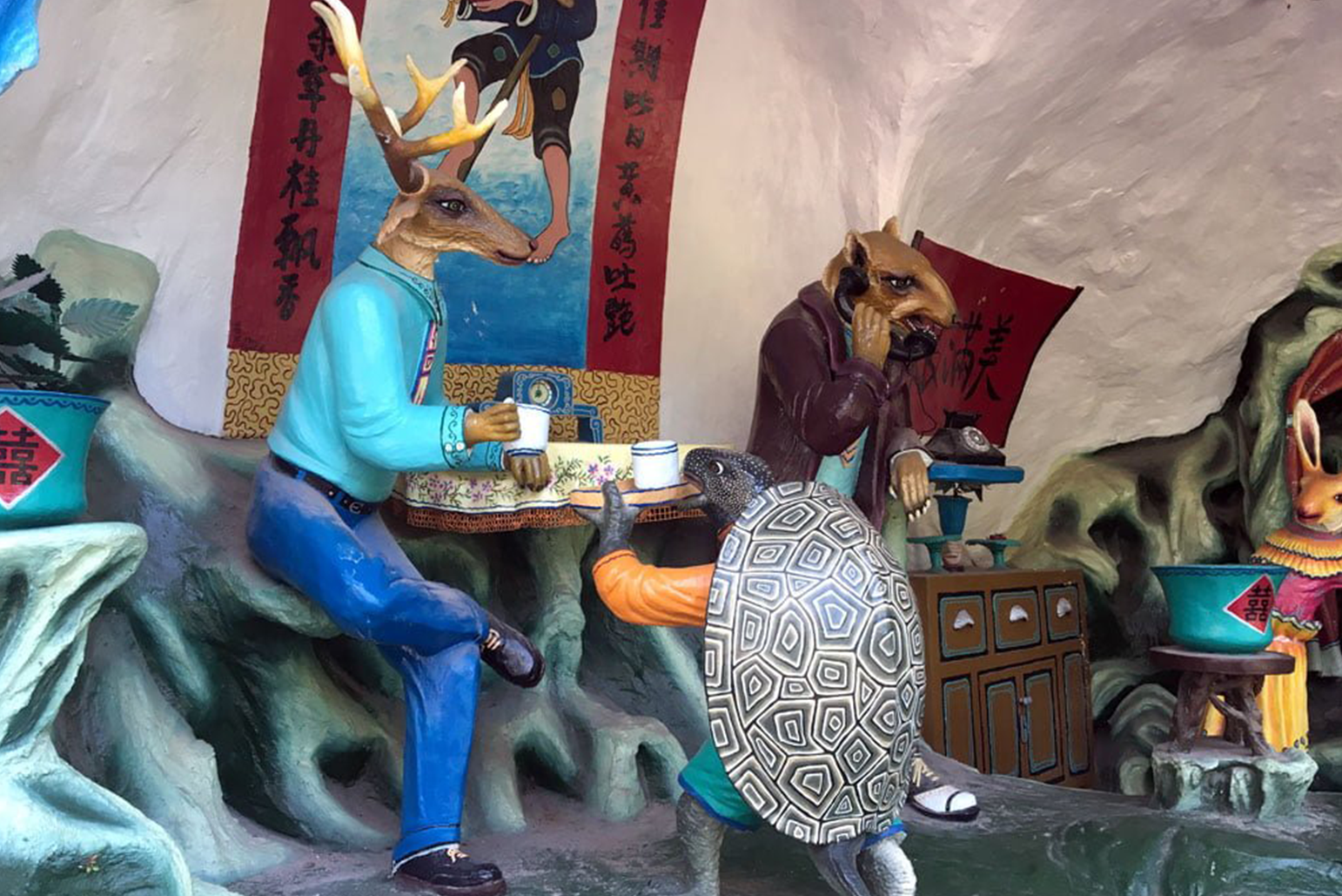 A gaggle of humanoid geese engaged in a domestic dispute, a gory battle between fish-men and warriors, monkeys bearing rifles, and a turtle riding an emu—these are some of the scenes one can expect to encounter when visiting Haw Par Villa in Singapore. However, underneath the absurd collection of over 1000 public sculptures and 150 giant dioramas is a compelling insight into Chinese folklore about death, punishment, and hell that are interlaced with attractions which nod to the park’s unique history and origin.
