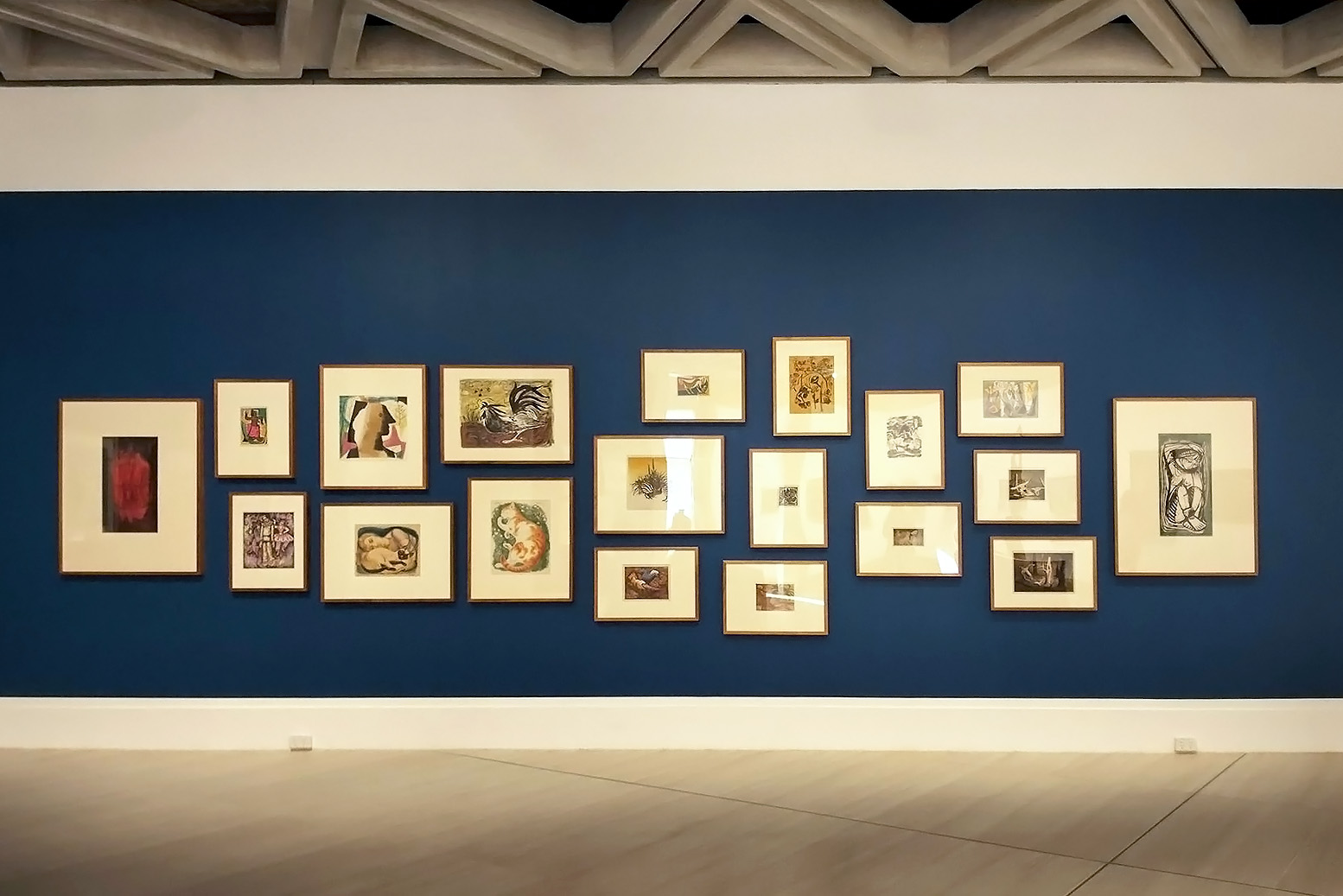 Looking further, we find the same annular shapes on this wall that were prevalent in Macqueen’s lithographs. Scott’s Three White Leopards and Ogilvie’s Eucalyptus Seed Pods are examples of this. Whilst both small works do extend to the edge of the page, the circular framing persists with the bubble of white negative space circling around the leopards and seed pods rather than the entire scene. The negative space which pushes inwards towards the subjects recreates the compositional organisation that was prevalent in Bellette and Preston’s oil paintings.