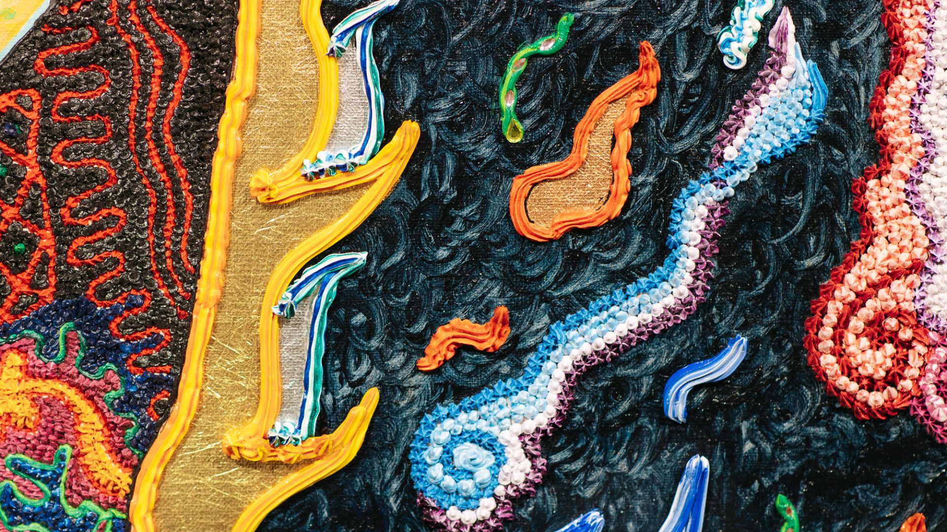 Sometimes artists use experimental methods to disguise a lack of technical aptitude—the kind involved in the presentation of fully resolved work. This is not the case with Khadembashi. She is immediately recognisable as an accomplished figurative oil painter, exploring with sculptural impasto and novel materials (including synthetic eyelash extensions and rhinestones).