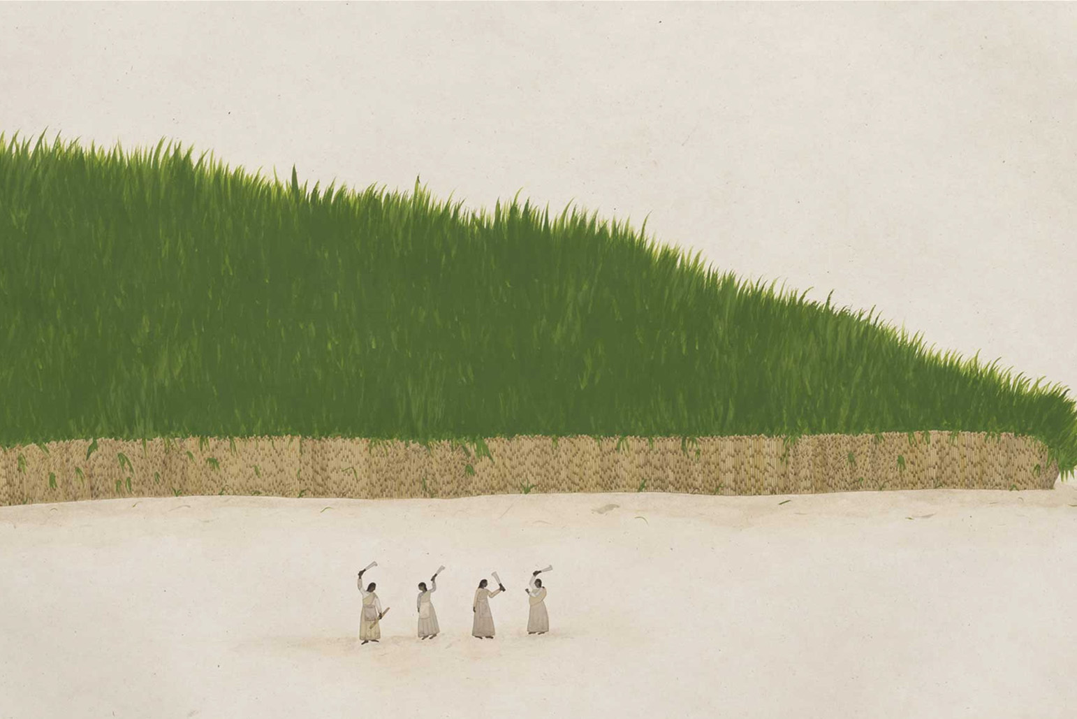 1. Sancintya Mohini Simpson, The Plantation (detail), 2022, watercolour and gouache on handmade wasli paper, 6 panels each approx. 95 x 125cm irreg., 190 x 375cm overall, image courtesy the artist and Milani Gallery, Meanjin/Brisbane, photo: Carl Warner