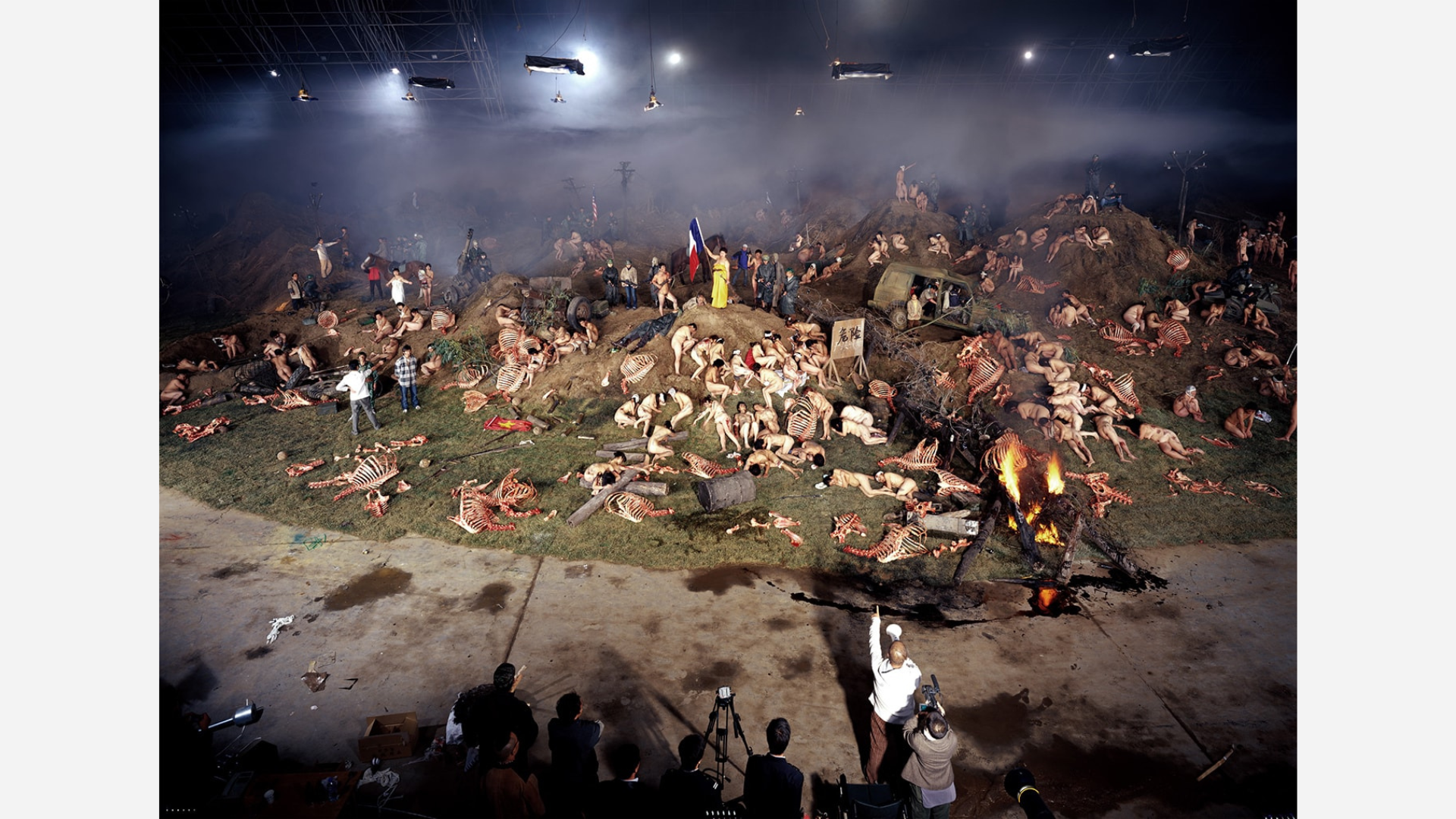 To some, Wang’s photography may appear too convoluted and referential to provoke censorship. Yet, it is precisely the convolution—the kaleidoscope of items, symbols, and objects within the photographs—that allows Wang’s pointed political critique to occur at all. In some respects, one might conceive of Wang’s photographic practices as a kind of collaboration with the censors themselves—preemptively developing aspects of the compositions that provide explanations that divert or ameliorate the censors’ concerns. On the flipside, censors of Wang’s photography also find inventive ways to interrupt the production of his work. The Blood of the World is a fascinating example. In the upper portion of the photograph, a grisly battlefield is staged: tonnes of cow carcasses are strewn across the set, which quickly become apparent to have been constructed within a warehouse. Examination of the “battlefield” portion of the image reveals myriad historical references: the famous 1968 Vietnam War image, Saigon Execution, by photojournalist Eddie Adams; an allusion to Eugène Delacroix’s Liberty Leading the People (1830); a restaging of Goya’s The Third of May 1808 in Madrid (1814)—which, here, looks as much like an ‘80s office worker as it does a Spanish rioter facing execution by Napoleon's forces. Naked bodies and piles of cow carcasses are scattered over the churned soil. Then toward the lower portion of the image, we see Wang directing his crew and actors—shattering any illusion that this is anything but a set. Yet, this behind-the-scenes photograph is not how Wang envisaged The Blood of the World. Police arrived at the warehouse, tipped off about the production and concerned there was some kind of porn being filmed. Wang was arrested and imprisoned for a few nights. The photographs which had been taken, up until the tip-off, were confiscated, and have never been seen since. All that survived is this behind-the-scenes image, which is now both a record of Wang’s processes and of his relationship with censorship.
