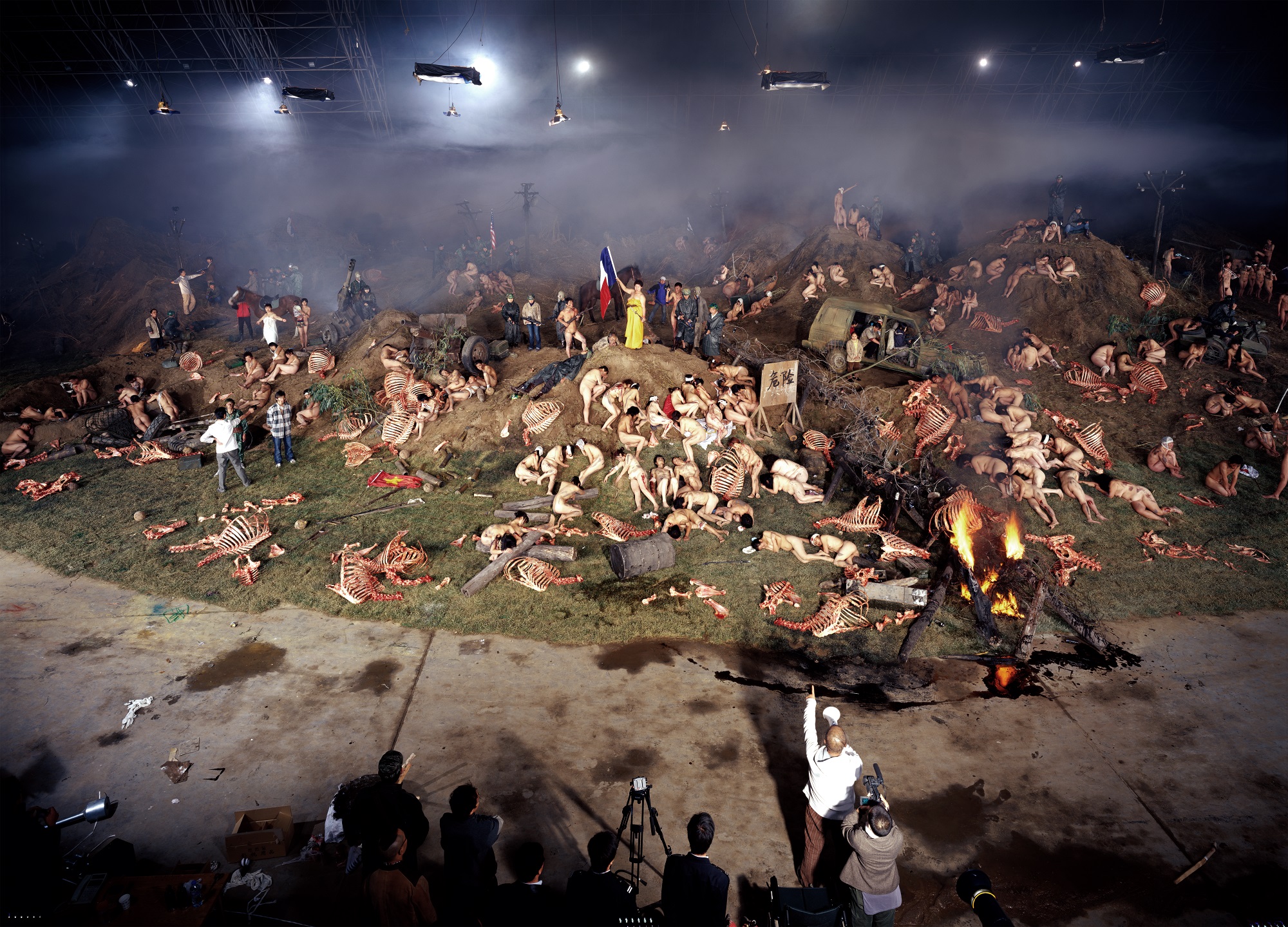 To some, Wang’s photography may appear too convoluted and referential to warrent censorship. Yet, it is precisely the convolution—the kaleidoscope of items, symbols, and objects within the photographs—that allows Wang’s pointed political critiques to occur at all. In some respects, one might conceive of Wang’s photographic practices as a kind of collaboration with the censors themselves—preemptively developing elements within the compositions that provide Wang with explanations that he might use when attempting to ameliorate the censors’ concerns. Conversely, censors of Wang’s photography have also found inventive ways to interrupt his work. The Blood of the World is a fascinating example: in the upper portion of the photograph, a grisly battlefield is staged. Examination of the “battlefield” portion of the image reveals myriad historical references: a restaging of the famous 1968 Vietnam War image, Saigon Execution, by photojournalist Eddie Adams; an allusion to Eugène Delacroix’s Liberty Leading the People (1830) and Goya’s The Third of May 1808 in Madrid (1814)—the latter looking as much like an ‘80s office worker as it does a Spanish rioter facing execution by Napoleon's forces. Naked bodies and tonnes of cow carcasses are scattered over the churned soil. Then toward the lower portion of the image, we see Wang directing his crew and actors, shattering any illusion that this is anything but a studio set. This “behind-the-scenes” photograph is not how Wang envisaged The Blood of the World. Not long after this image was taken, police arrived at the warehouse, tipped off about the production. Under the premise that some kind of strange pornography was being filmed, police suspended the production. Wang was arrested and imprisoned for a few nights. What photographs had been taken, up until the tip-off, were confiscated, and have never been seen since. All that survived is this behind-the-scenes shot, taken by one of Wang’s entourage—thus turning The Blood of the World into both a record of Wang’s process and of his relationship with censorship.