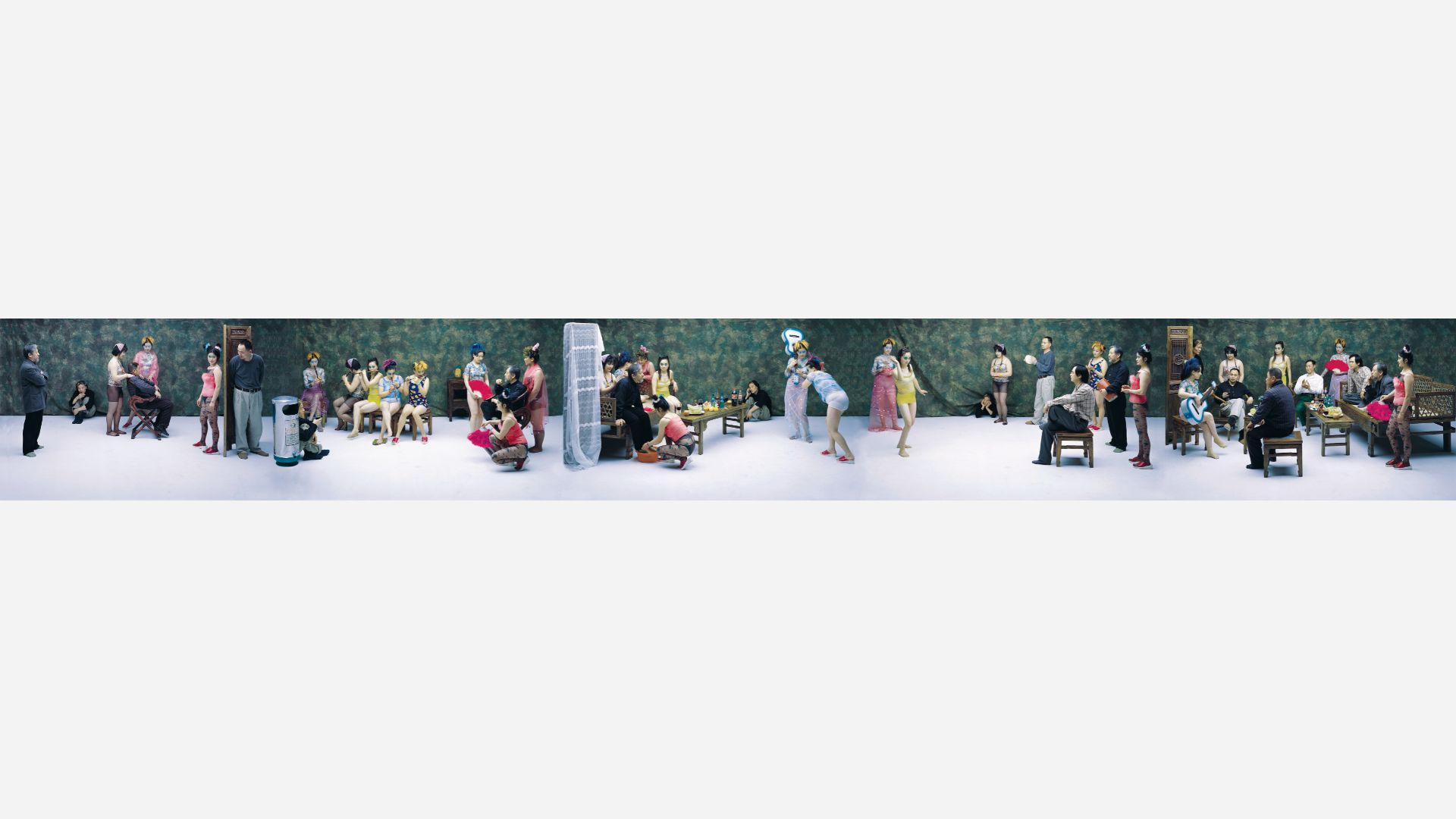 Against a marbled grey backdrop, a group of women clad in kitschy lingerie entertain a gathering of old men. Across five interconnected tableaux we see the women performing massages, playing wind instruments, dancing, strumming a guitar, and fawning over the men. The scene is at once uneasy and banal, unsettling and unremarkable. It is Wang Qingsong’s Night Revels of Lao Li (老栗夜宴图, 2000), a metres-long photographic montage. The work is exemplary of Wang’s renowned large-scale staged photographs, but also of his penchant for historical reference and restaging. The revelry referenced is that of Han Xizai, the 10th century official of the Southern Tang Dynasty. Han grew a reputation as a talented advisor, captivating speaker, and fashionista, wooing his contemporaries with bespoke hats. As he served under successive emperors of the Southern Tang, his standing grew, but so too did the rumours of his overindulgence and his debaucherous parties. The young emperor Li Yu, the “Last Lord Li”, cottoned on to Han’s predilections. Eager to persuade Han to show restraint, Li enlisted the help of court painter Gu Gongzhong, who was instructed to infiltrate one of Han’s lurid parties. There, Gu was to collect evidence of decadence and debauchery, and record it in a painting—what would become the over three-metre-long handscroll, Night Revels of Han Xizai (韩熙载夜宴图), which today is held in the Imperial Palace Collection, Beijing. Among the scenes of partying performers and guests, we see Gu lurking in the background, glum and detached. Roughly one thousand years later, in Night Reels of Lao Li, Wang casts himself as the indifferent Gu, and his friend and esteemed art critic Li Xianting as Han Xizai—the titular “Lao” being a designation used for a respected familiar senior. In Wang’s version, the escorts are clad in gaudy garments, the banquets now consist of cheap crisps, Coca-Cola and cognac, and Wang (as Gu) is seen hiding behind a metal wastebin. Perhaps Wang’s pastiche of Tang Dynasty decadence suggests a contemporary underbelly of overindulgence and exploitation among the hierarchies of today’s bureaucracy. It also wryly reflects the tensions and anxieties of a culture undergoing monumental economic changes—in one image, the antagonisms of a venerated antiquity and commodified modernity emerge.