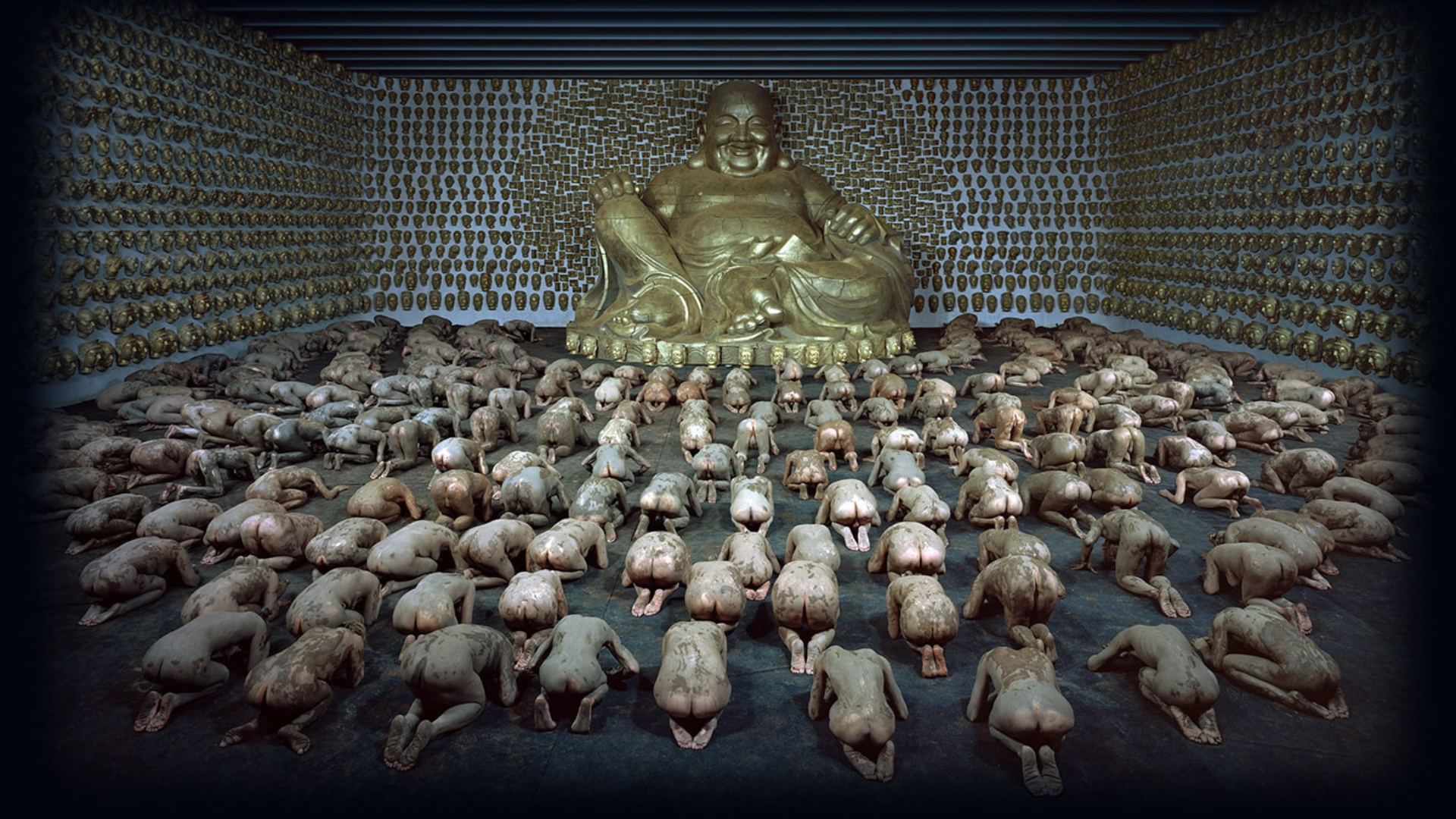 While it was painting in which Wang first attempted to realise his creative vision, he soon took up the camera—photography allowing him to quickly capture the theatrical and hyper-referential images he desired to compose. Everlasting Inscription offers a sample of his development as a photographer: his earlier works Requesting Buddha Series No. 1 (拿来千手观音系列之一, 1999), Night Revels of Lao Li (老栗夜宴图, 2000), and the immense Dormitory (宿舍, 2005) are all exemplary of Wang’s experimentations in Photoshop—sometimes subtle and sometimes overt; while Dream of Migrant (盲流梦, 2005) and The Blood of the World (世界的血, 2006) are exemplary of Wang’s shift in interest toward meticulous large-scale sets; while the more recent Work! Work! Work! (工作!工作!再工作!, 2012) and The Blood-stained Shirt (血衣, 2018) illustrate Wang’s commitment to carefully staging the intricate scenes, yet this time in real-world locations (the former shot in the architectural firm of Ole Scheeren, who designed the famous Beijing CCTV Headquarters colloquially referred to as the “big boxer shorts” (大裤衩), while the latter was photographed at the site of a burned-out warehouse in Detroit).